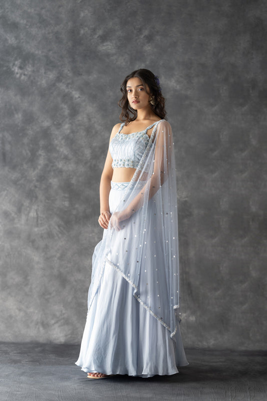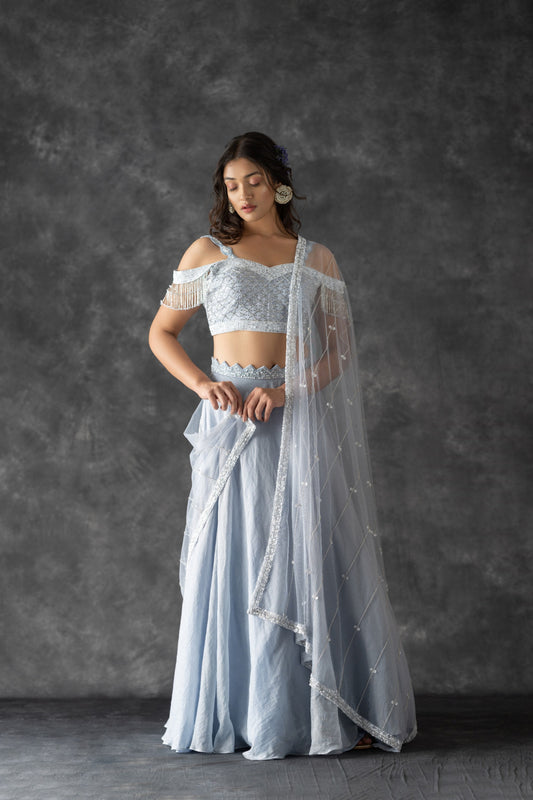 POWDER BLUE COLD SHOULDER BLOUSE AND SHIMMER LEHENGA SETRegular price INR. 44,800.00Regular priceUnit price / per-