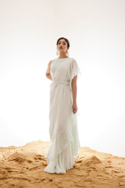 LIGHT MINT DRAPPED RUFFLE SAREE