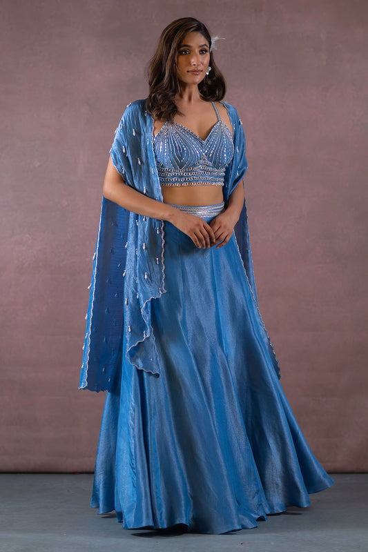 COBALT BLUE LONG SHRUG JACKET AND LEHENGA SET
