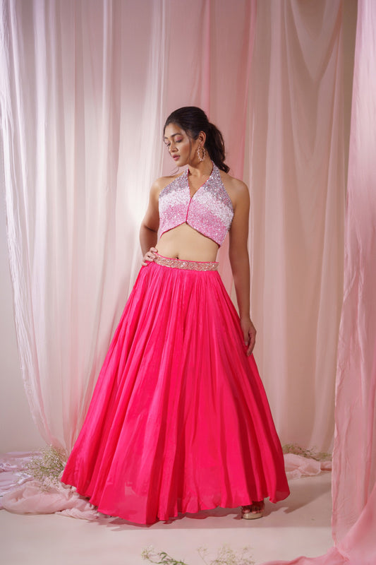 HOT PINK HALTER NECK BLOUSE AND LEHENGA SET