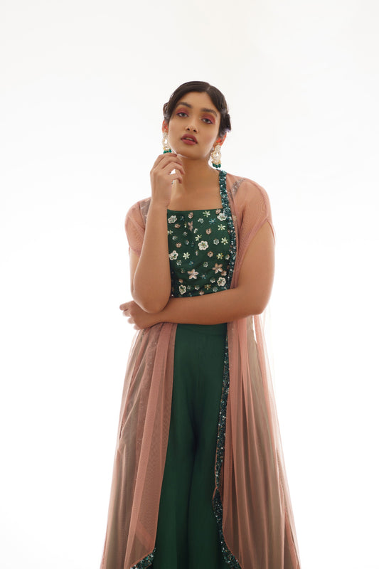 BOTTLE GREEN ONE SHOWLDER TOP AND PLAZZO SET WITH PINK SHRUG