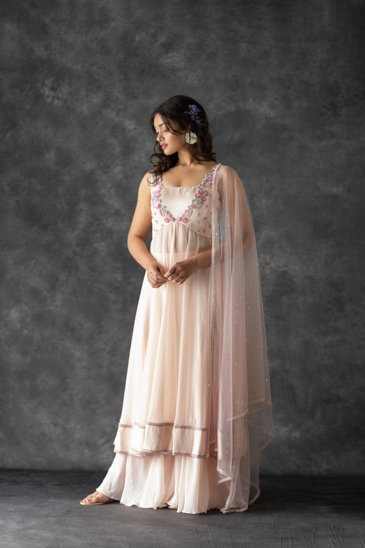 NUDE TUNIC AND PLAZZO SET WITH CHOKAR OBMRE DUPATTA
