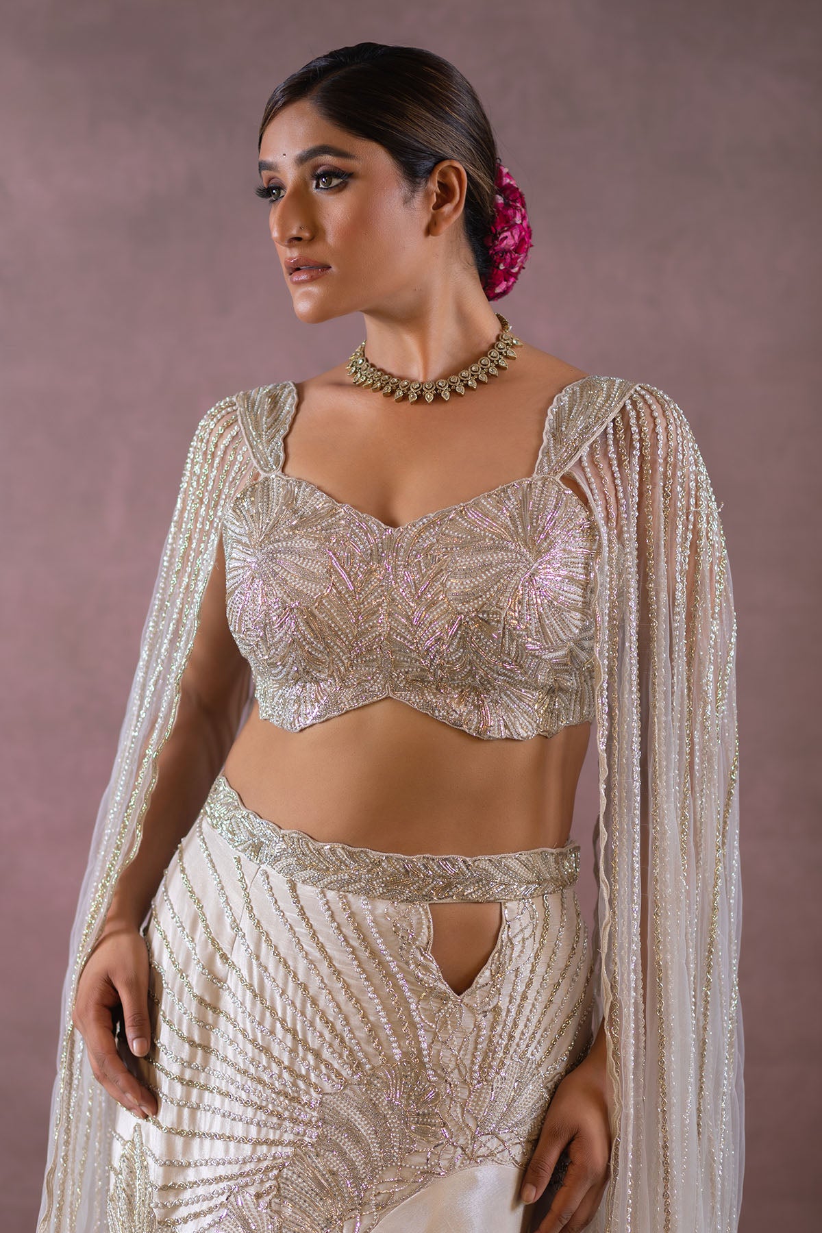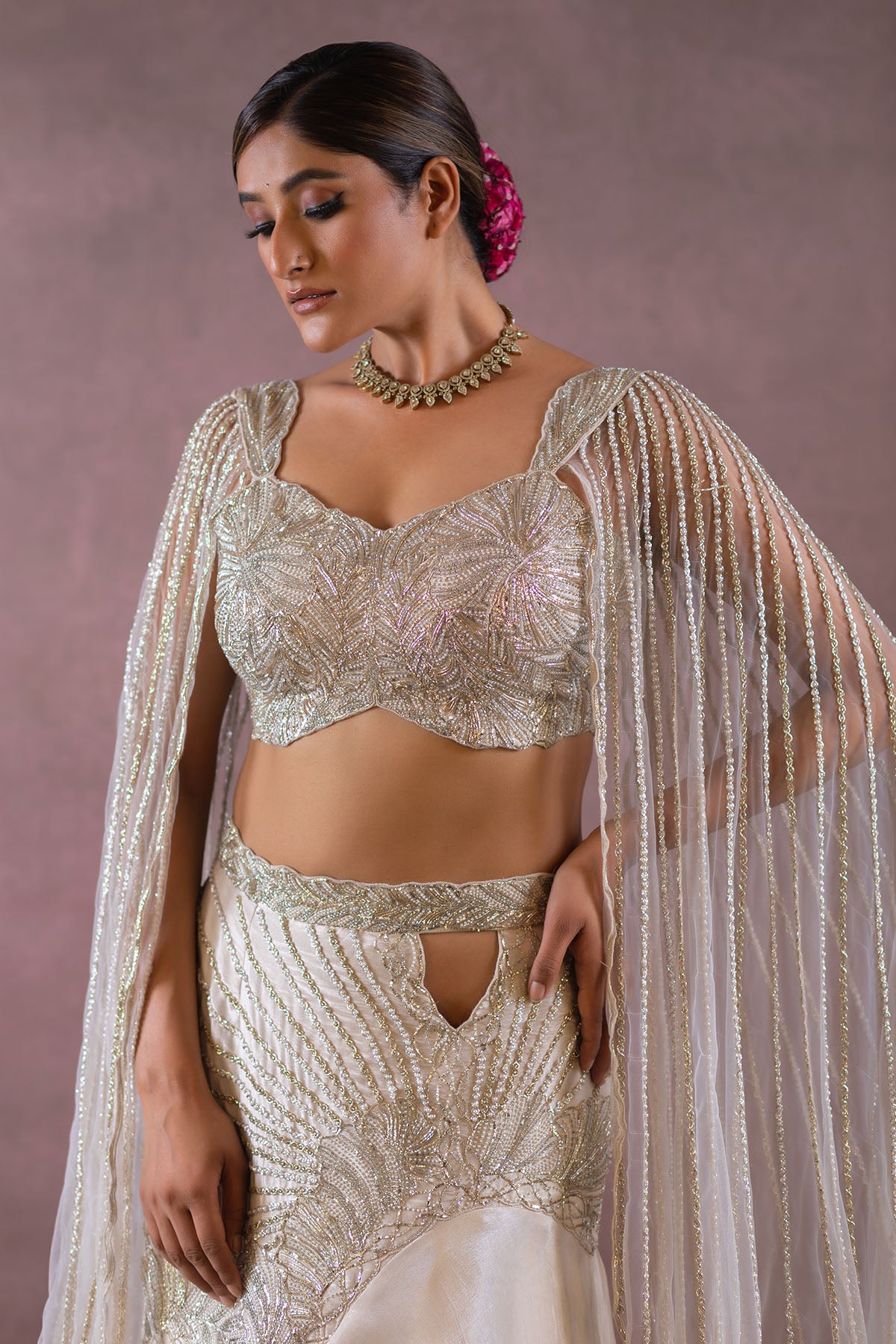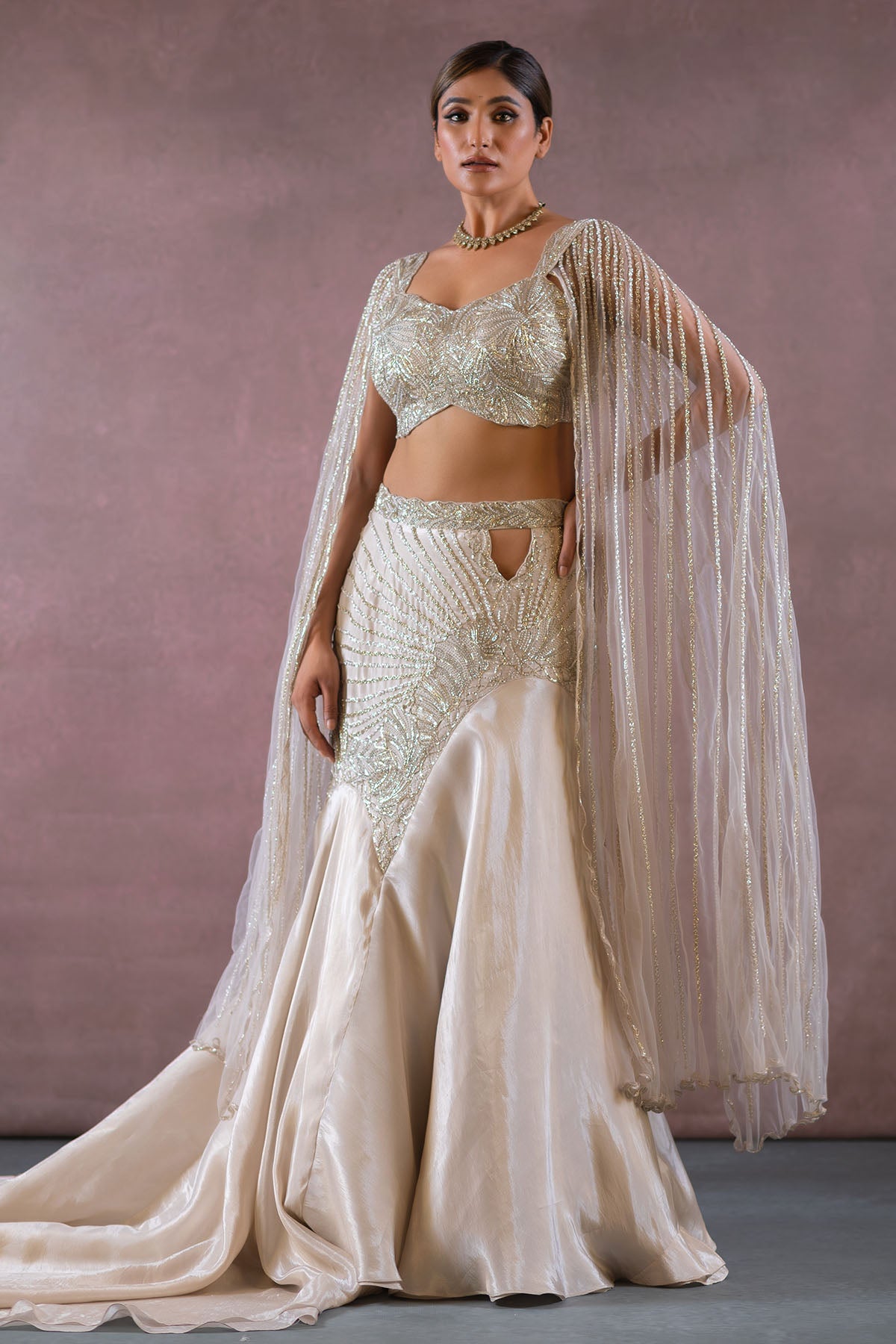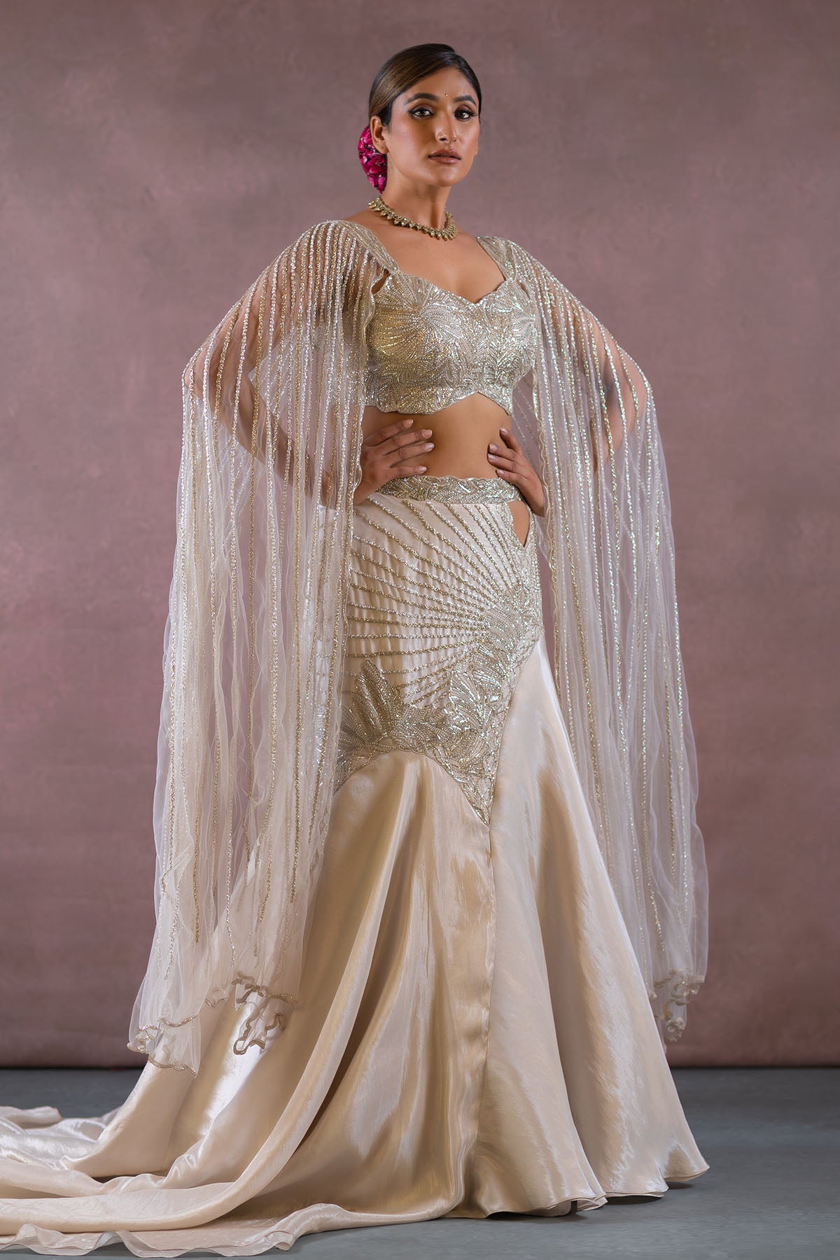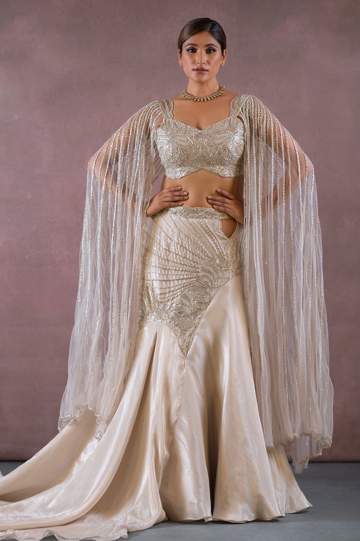 FEATURING A BEIGE MERMAID LEHENGA WITH TRAIL IN ZARI TISSUE BASE WITH ZARDOSI, PEARLS AND KASAB EMBROIDERY. IT IS PAIRED WITH AN EMBROIDERED BOUSE HAVING A SWEETHEART NECKLINE AND CAPE SLEEVES. ACCENTUATE WITH STATEMENT JEWELLERY AND HEELS FOR SANGEET,COCKTAIL OR RECEPTION CEREMONY.