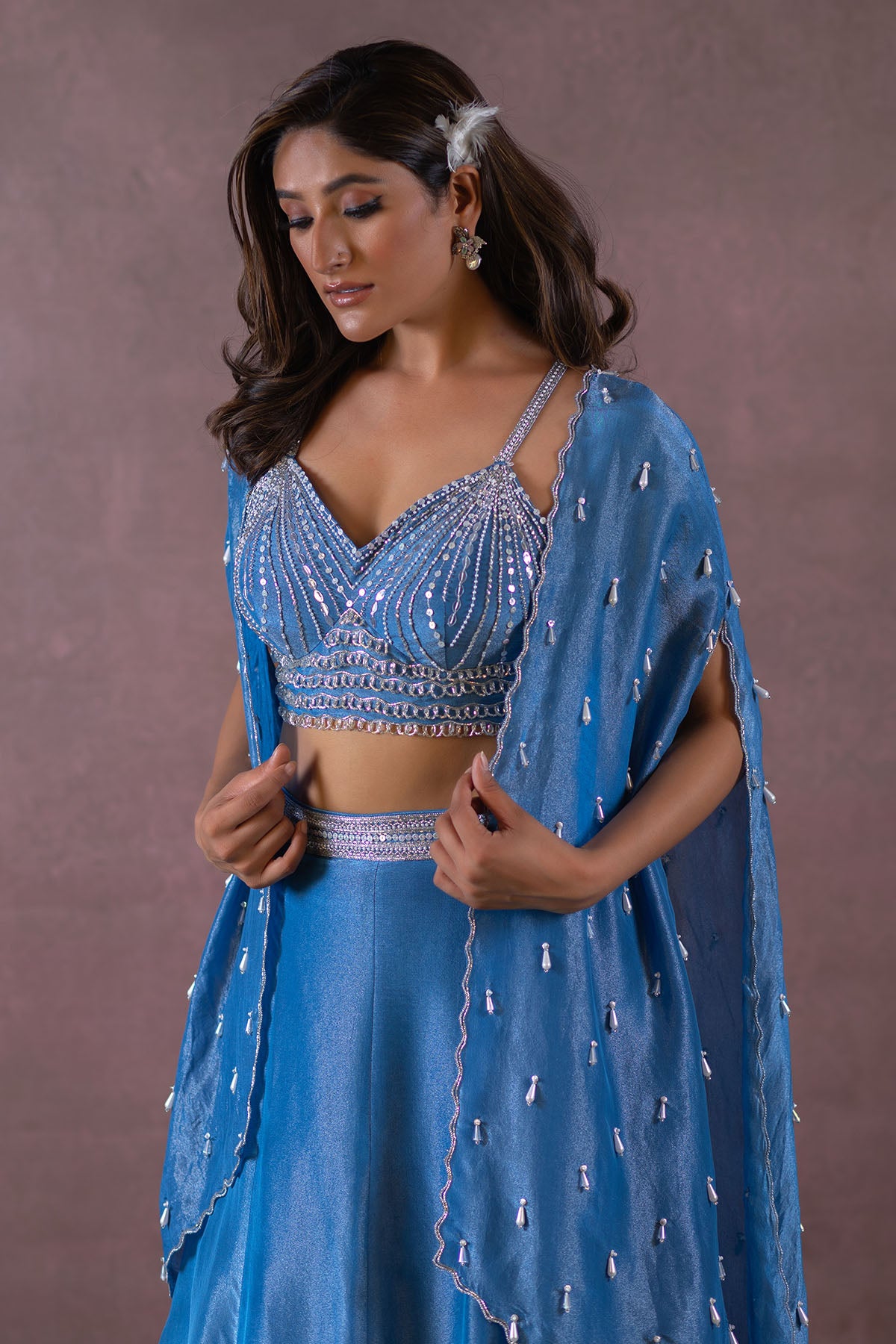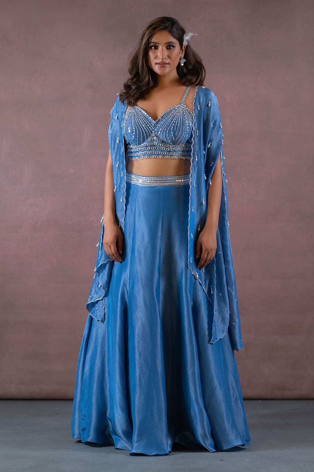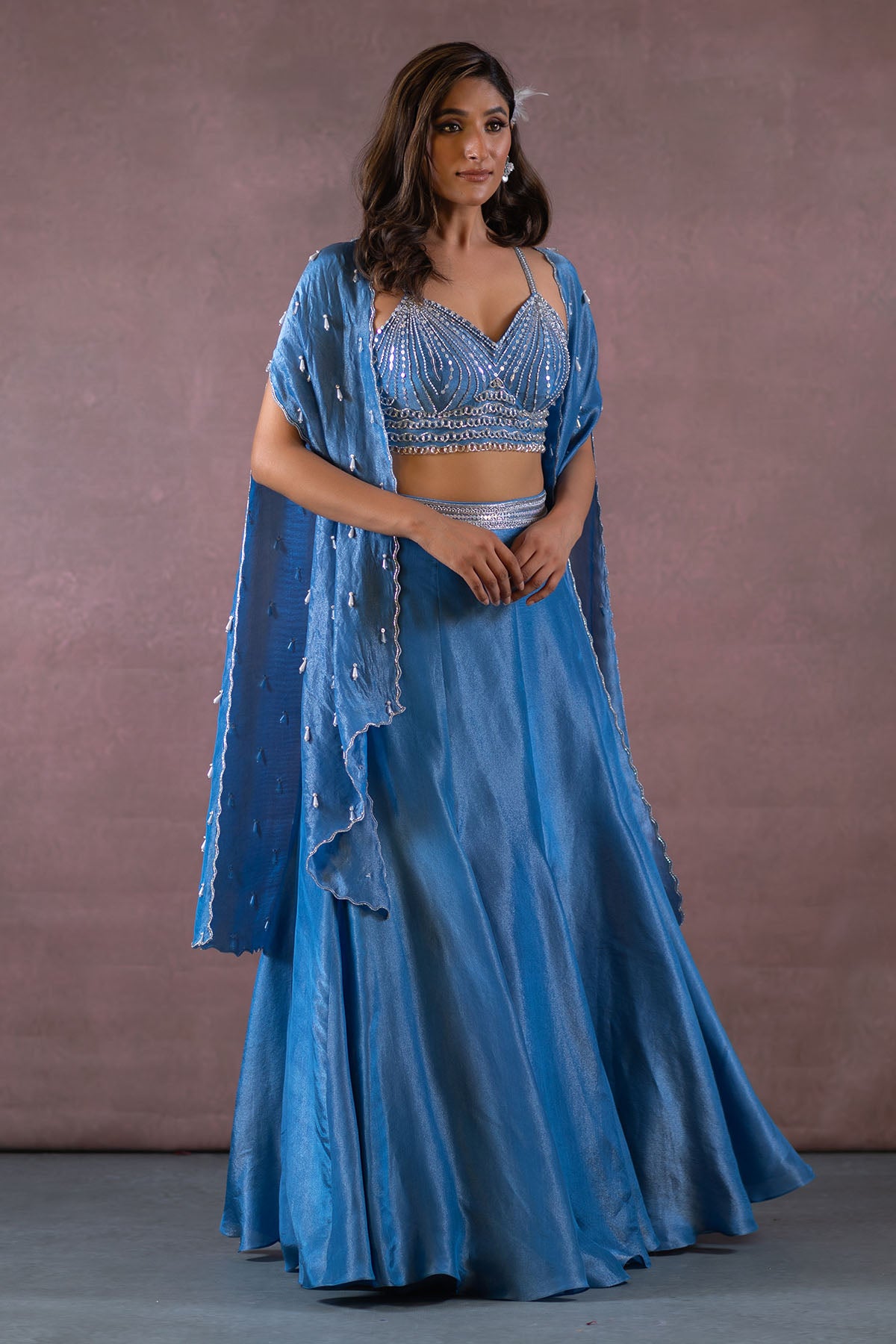 THIS SET FEATURES COBALT BLUE HAND EMBROIDERED BUSTIER-BLOUSE WITH TASSEL DETAILS & SPAGHETTI STRAPS. COMES WITH FISH CUT ZARI TISSUE LEHENGA WITH EMBROIDERED WAISTBAND PAIRED WITH HAND EMBROIDERED CAPE WITH TASSELS AND BORDER ALL OVER.