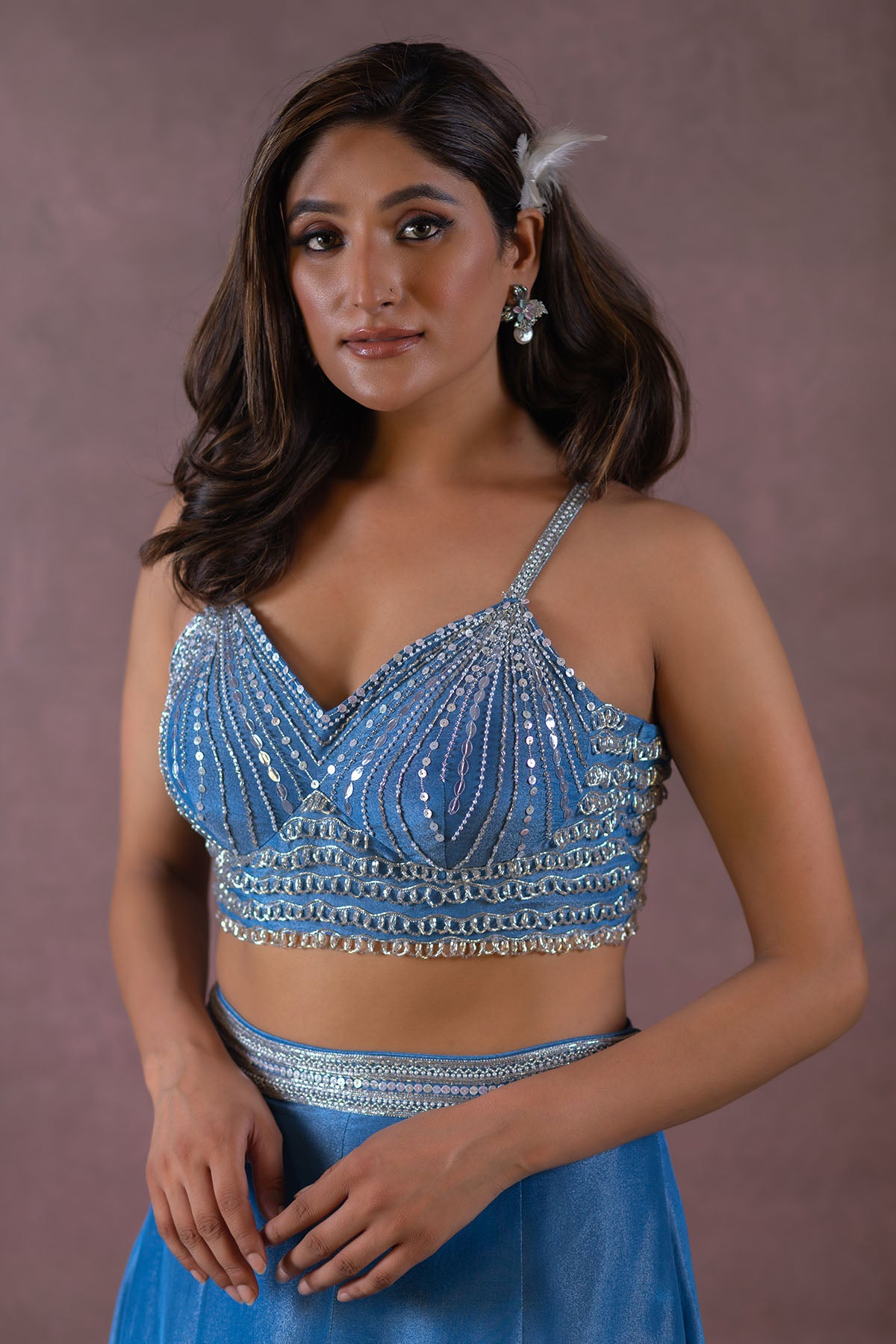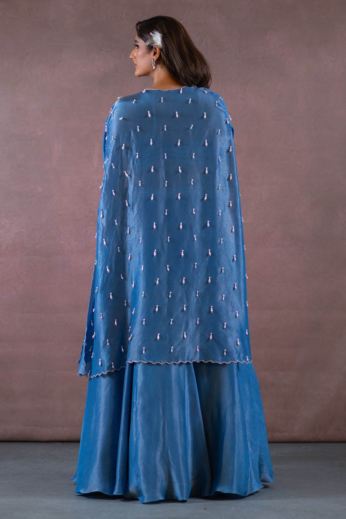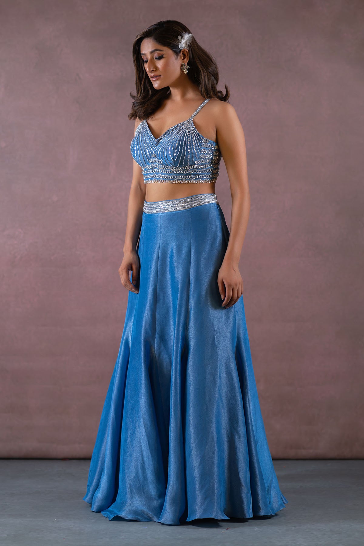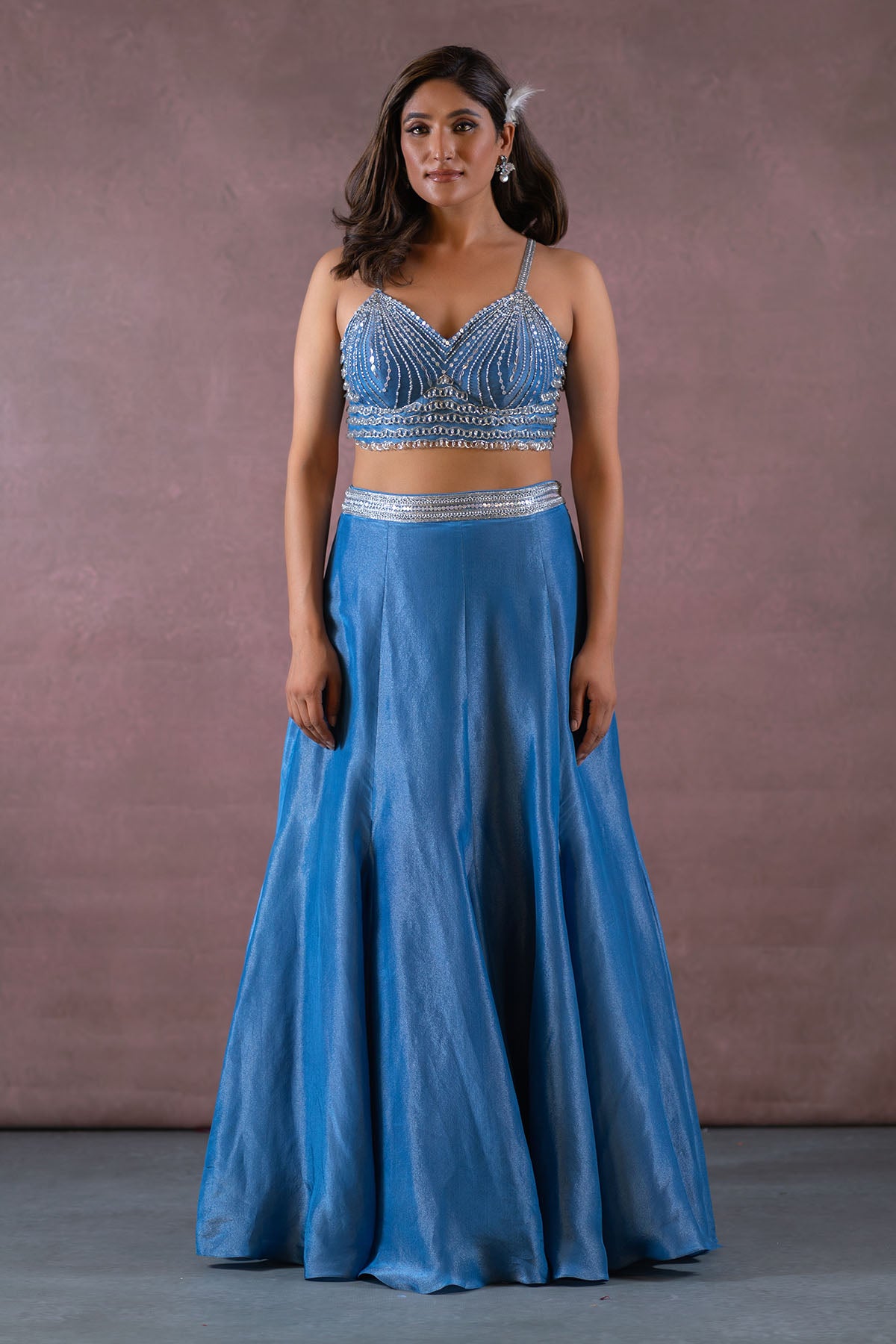 THIS SET FEATURES COBALT BLUE HAND EMBROIDERED BUSTIER-BLOUSE WITH TASSEL DETAILS & SPAGHETTI STRAPS. COMES WITH FISH CUT ZARI TISSUE LEHENGA WITH EMBROIDERED WAISTBAND PAIRED WITH HAND EMBROIDERED CAPE WITH TASSELS AND BORDER ALL OVER.